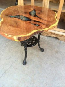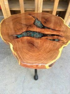 Door ook fluorescerend pigment te gebruiken, worden onvolkomenheden in het hout versterkt, waardoor het een modern en origineel object wordt.