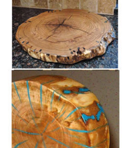 Beginnen met gieten (met een plastic kannetje met een tuit) vanuit het midden van het houtblok. Aangezien de randen van de boomstam meestal niet gelijk zijn, moeten we proberen het langzaam en gelijkmatig over het oppervlak te gieten. Op deze manier bereikt u gemakkelijk een “spiegeleffect”.