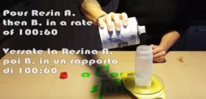 Voorbereiding van de kunsthars: wij raden aan 200-250 g hars per m2 tafeloppervlak voor te bereiden. Meng het zorgvuldig en volg alle instructies in de doos. Laat de kunsthars rusten (5 min) zodra het goed gemengd is, zodat de in het mengsel gevormde luchtbellen de tijd hebben om te rijzen.