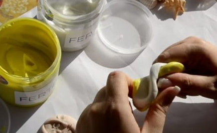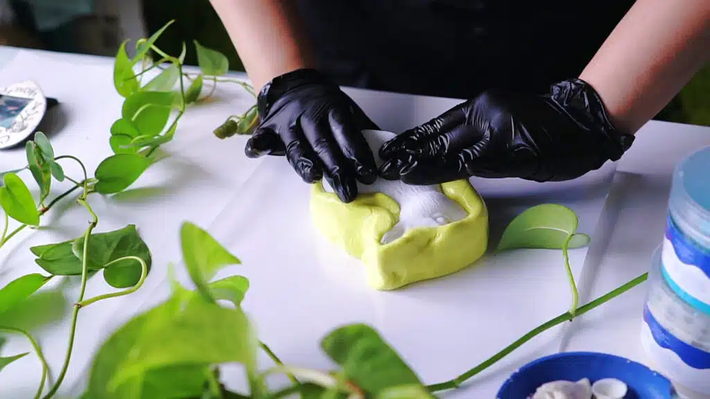 Hetzelfde geldt voor kneedbaar siliconenrubber, dat zorgvuldig moet worden ingedrukt om elk detail van de mal te bereiken. Zodra het is uitgehard, kan het aan de bovenkant worden doorgesneden om in een latere fase de epoxyhars te gieten om serieproductie van objecten mogelijk te maken.