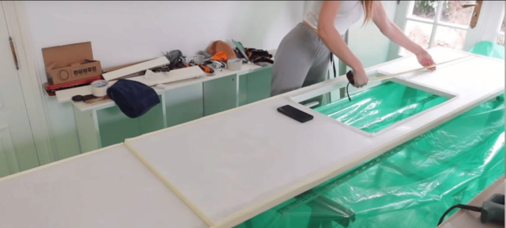 - Vervolgens maakte hij de tafel stofvrij en plakte hij de randen af met tape, waardoor hij beschermende randen creëerde.