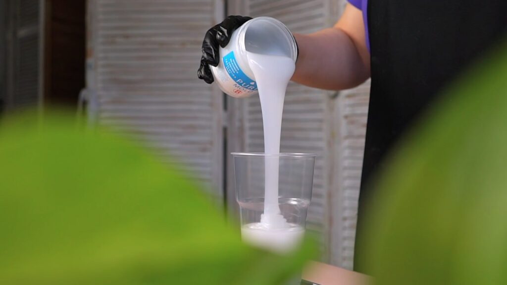 Breng eerst een lossingsmiddel aan op het object. Giet vervolgens voorzichtig de siliconen over het object in gelijkmatige bewegingen om te voorkomen dat er te veel luchtbellen ontstaan. Indien nodig kun je de siliconen gelijkmatig verdelen met het roerstaafje.