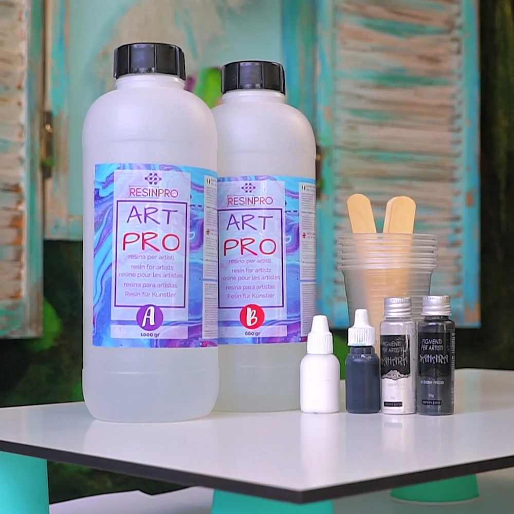 Inhoud set: epoxyhars, metallic pigmenten, vloeibare kleurstoffen, isopropylalcohol, instructies, roerstokjes, handschoenen.